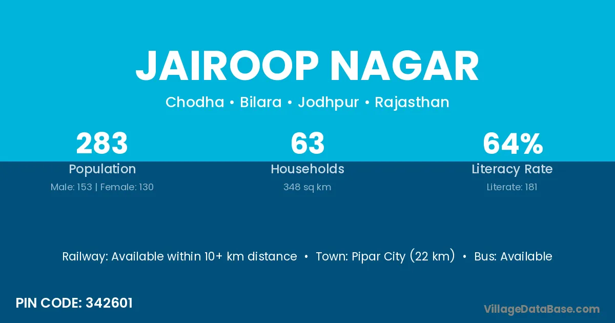 Pipar City (22 km) is the nearest town to Jairoop Nagar village for major economic activities and is located approximately 22 km away.