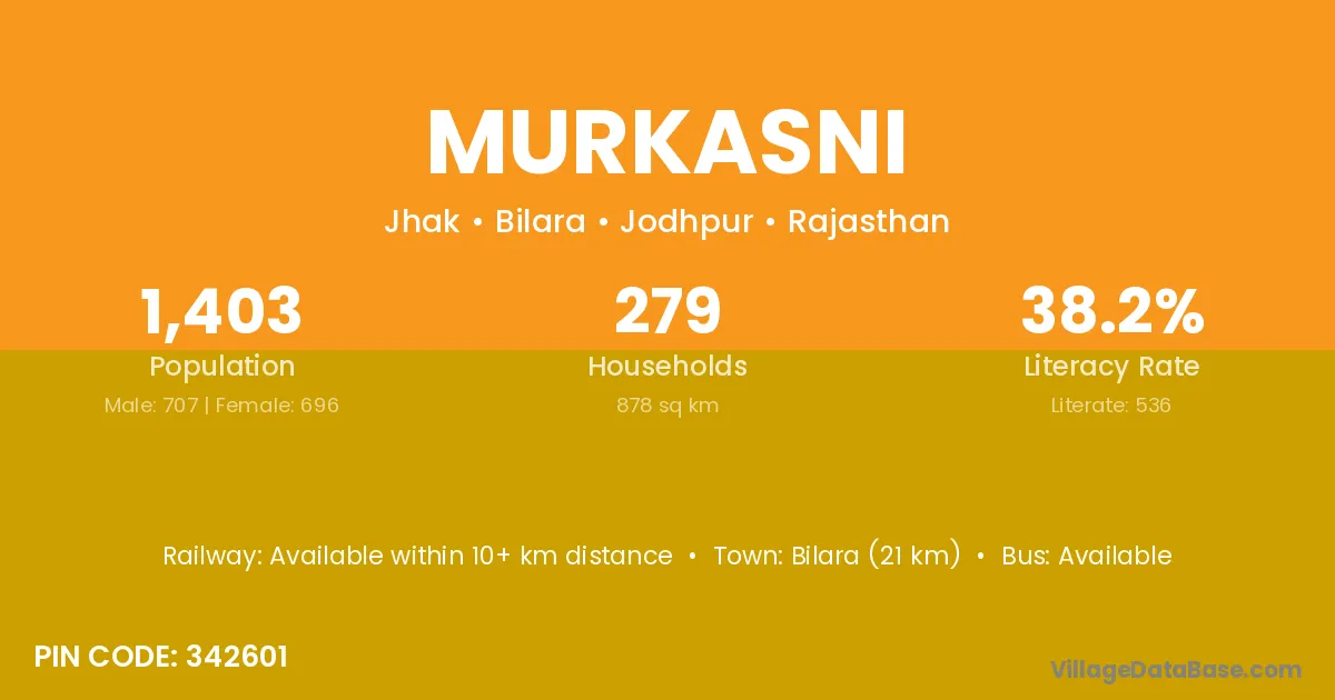Bilara (21 km) is the nearest town to Murkasni village for major economic activities and is located approximately 21 km away.