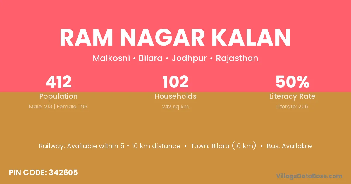 Bilara (10 km) is the nearest town to Ram Nagar Kalan village for major economic activities and is located approximately 10 km away.