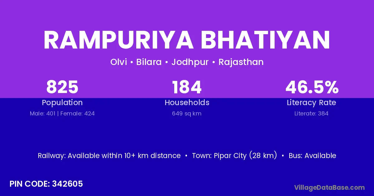 Pipar City (28 km) is the nearest town to Rampuriya Bhatiyan village for major economic activities and is located approximately 28 km away.