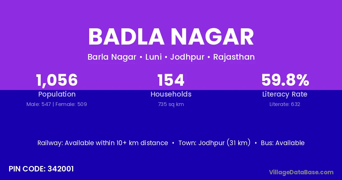 Jodhpur (31 km) is the nearest town to Badla Nagar village for major economic activities and is located approximately 31 km away.