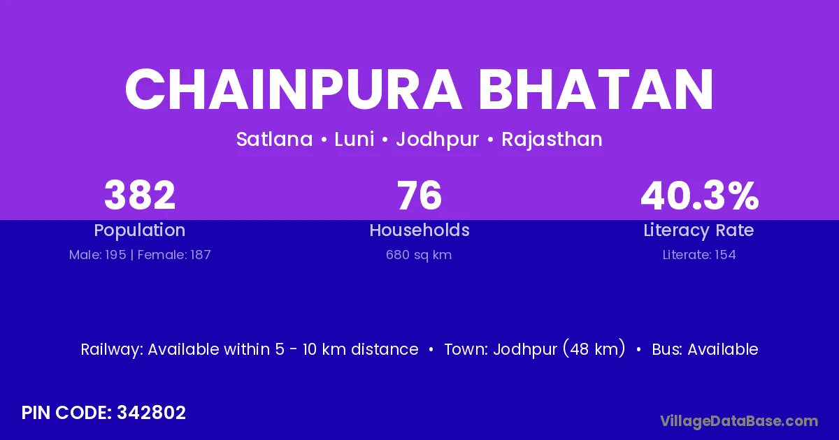 Jodhpur (48 km) is the nearest town to Chainpura Bhatan village for major economic activities and is located approximately 48 km away.