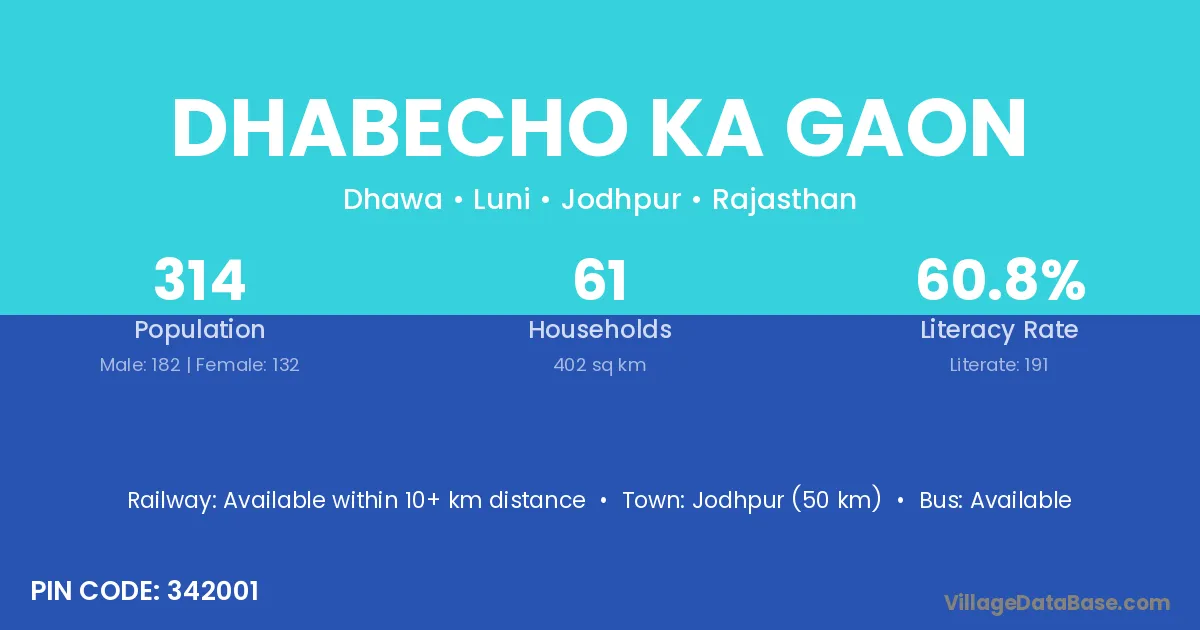 Jodhpur (50 km) is the nearest town to Dhabecho Ka Gaon village for major economic activities and is located approximately 50 km away.