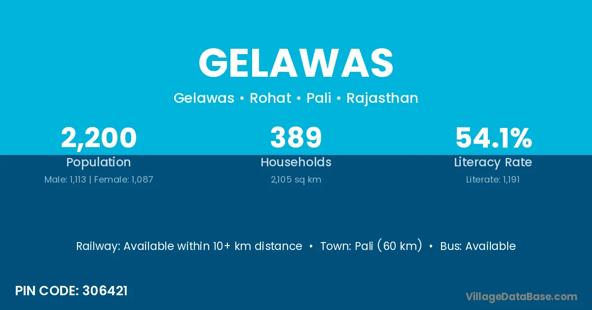 Jodhpur (40 km) is the nearest town to Gelawas village for major economic activities and is located approximately 40 km away.
