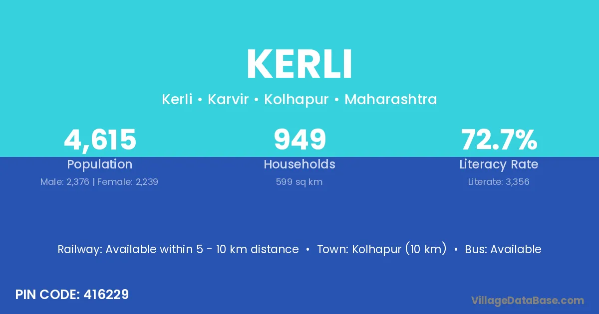 The literacy rate of Kerli village is 56.56%. Male literacy stands at 70.68% and female literacy at 42.09%.