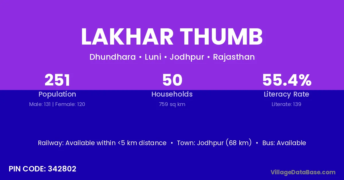Jodhpur (68 km) is the nearest town to Lakhar Thumb village for major economic activities and is located approximately 68 km away.