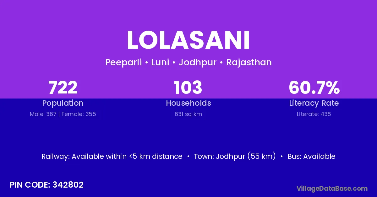 Jodhpur (55 km) is the nearest town to Lolasani village for major economic activities and is located approximately 55 km away.