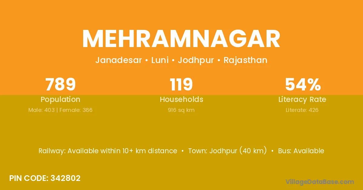 Jodhpur (40 km) is the nearest town to Mehramnagar village for major economic activities and is located approximately 40 km away.