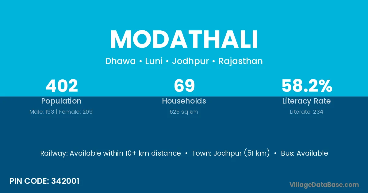 Jodhpur (51 km) is the nearest town to Modathali village for major economic activities and is located approximately 51 km away.