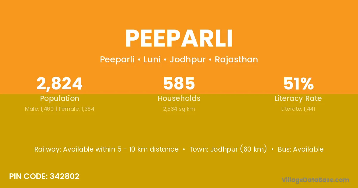 Jodhpur (60 km) is the nearest town to Peeparli village for major economic activities and is located approximately 60 km away.