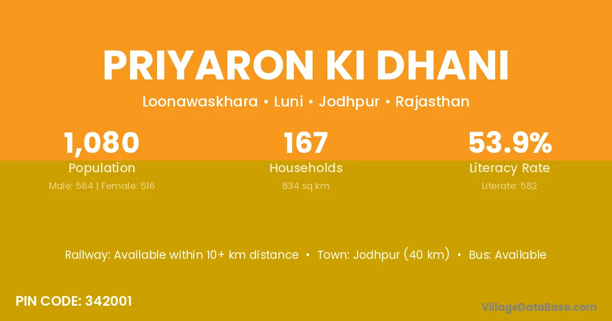 Priyaron Ki Dhani village has a total population of 1,080 people, of which 564 are males and 516 are females.