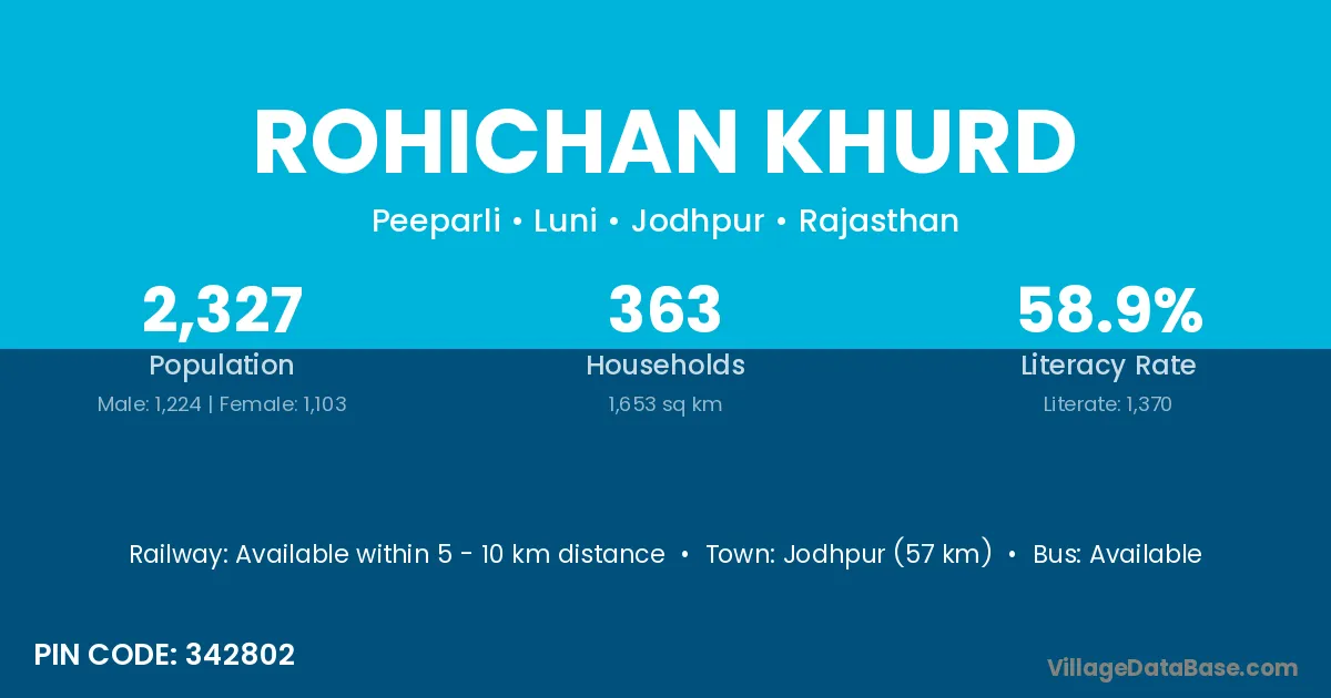 Jodhpur (57 km) is the nearest town to Rohichan Khurd village for major economic activities and is located approximately 57 km away.