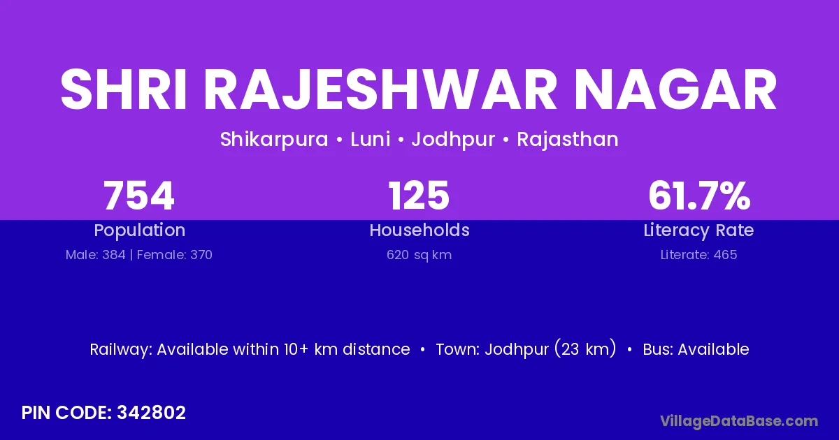 Shri Rajeshwar Nagar village has a total population of 754 people, of which 384 are males and 370 are females.