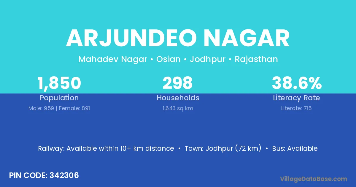 Jodhpur (72 km) is the nearest town to Arjundeo Nagar village for major economic activities and is located approximately 72 km away.