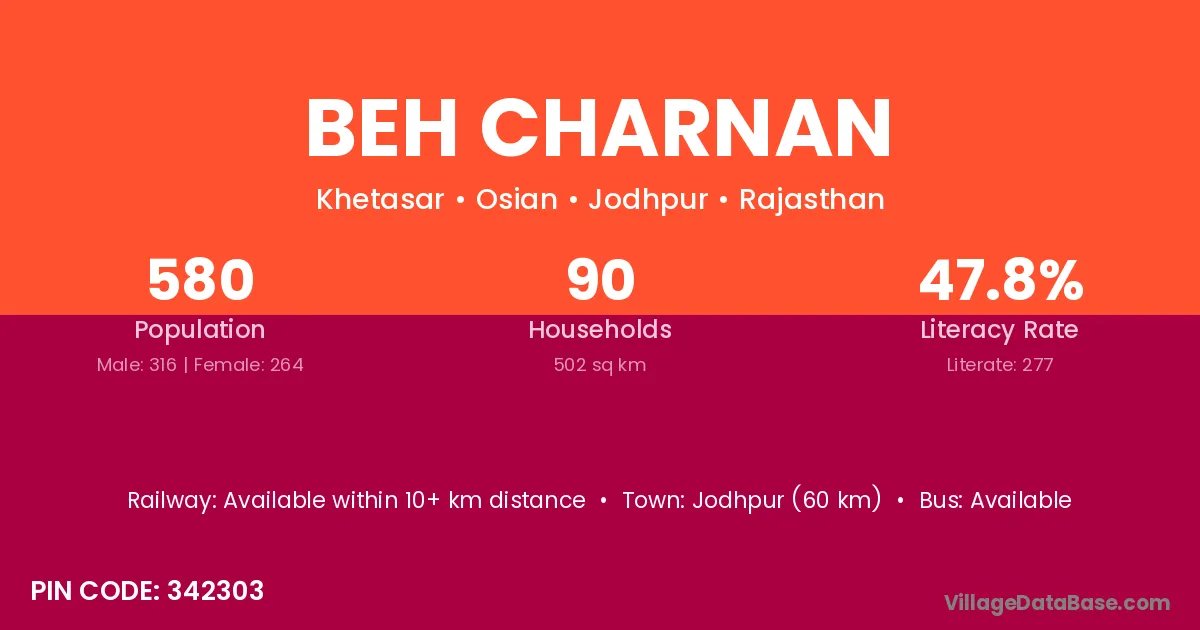 Jodhpur (60 km) is the nearest town to Beh Charnan village for major economic activities and is located approximately 60 km away.