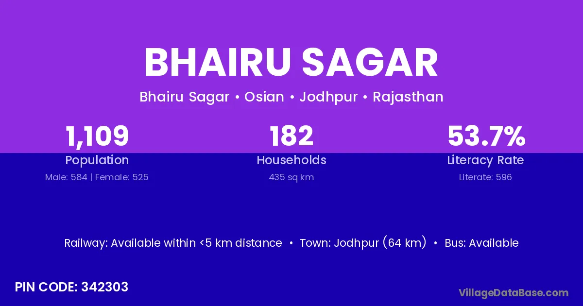 Jodhpur (64 km) is the nearest town to Bhairu Sagar village for major economic activities and is located approximately 64 km away.
