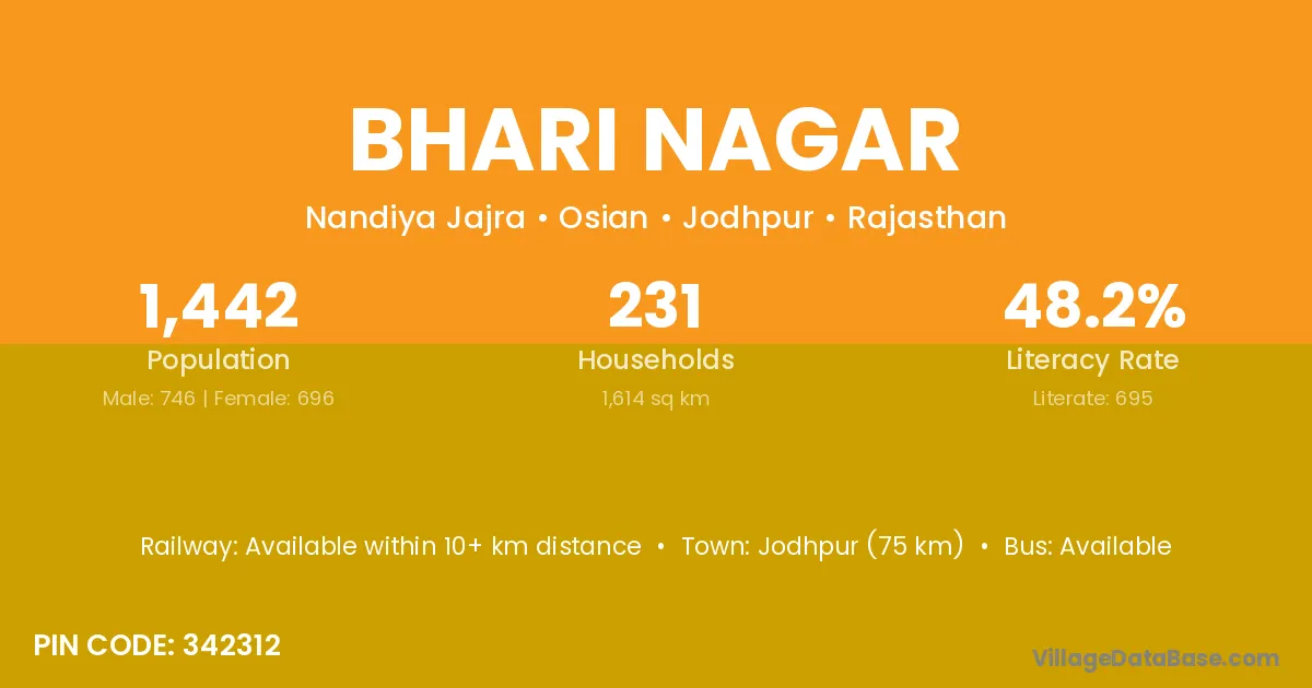Jodhpur (75 km) is the nearest town to Bhari Nagar village for major economic activities and is located approximately 75 km away.