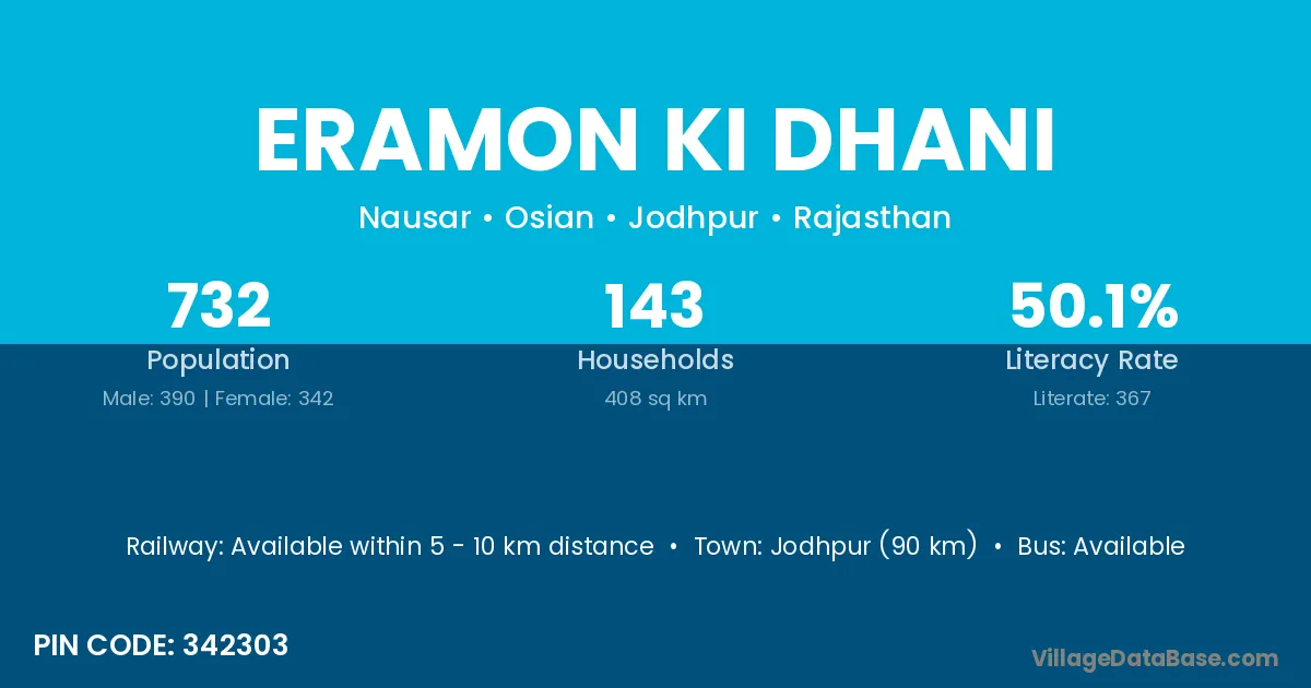 Jodhpur (90 km) is the nearest town to Eramon Ki Dhani village for major economic activities and is located approximately 90 km away.