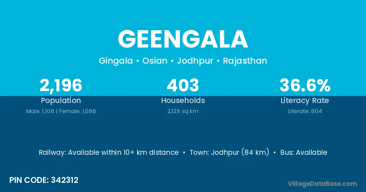 Jodhpur (84 km) is the nearest town to Geengala village for major economic activities and is located approximately 84 km away.