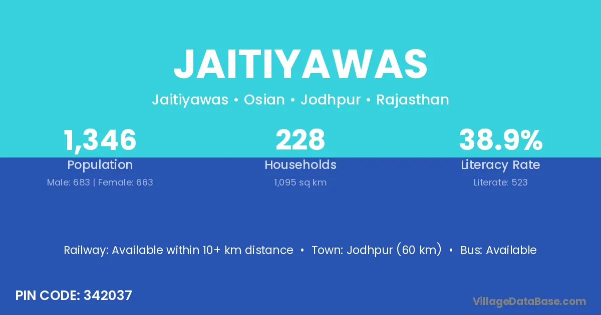 Jodhpur (60 km) is the nearest town to Jaitiyawas village for major economic activities and is located approximately 60 km away.