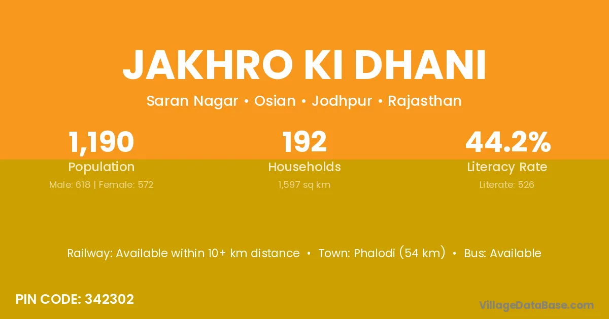Phalodi (54 km) is the nearest town to Jakhro Ki Dhani village for major economic activities and is located approximately 54 km away.