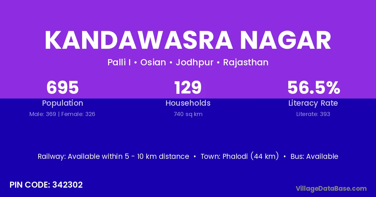 Phalodi (44 km) is the nearest town to Kandawasra Nagar village for major economic activities and is located approximately 44 km away.