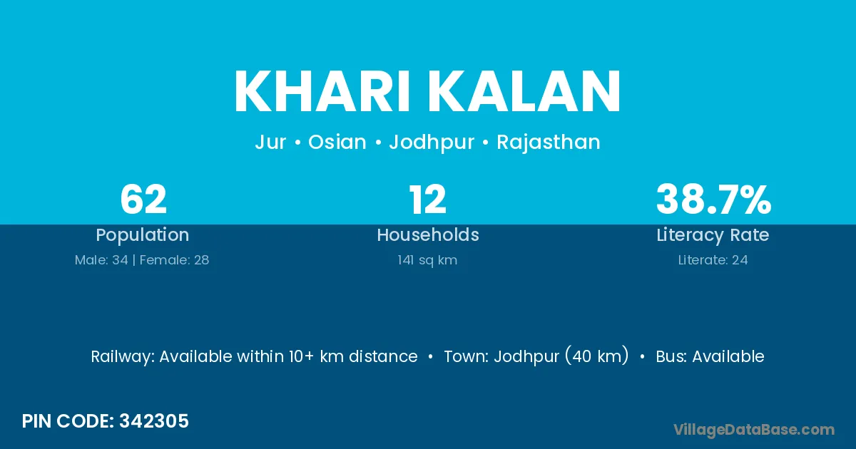 Jodhpur (40 km) is the nearest town to Khari Kalan village for major economic activities and is located approximately 40 km away.