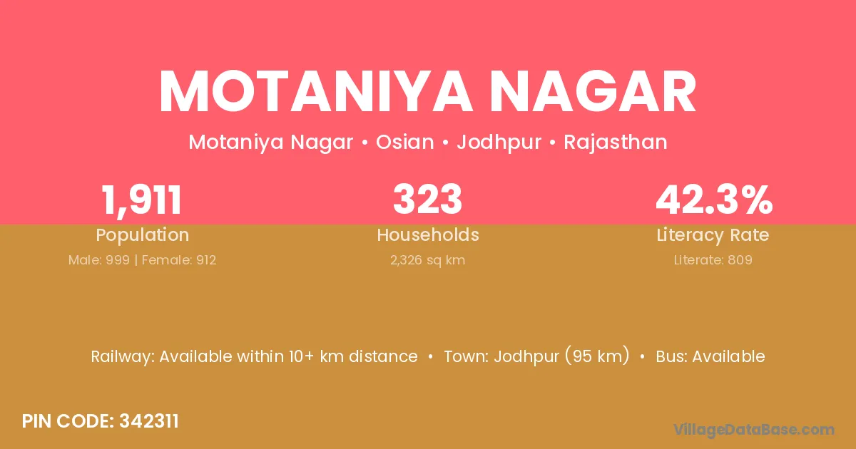 Jodhpur (95 km) is the nearest town to Motaniya Nagar village for major economic activities and is located approximately 95 km away.