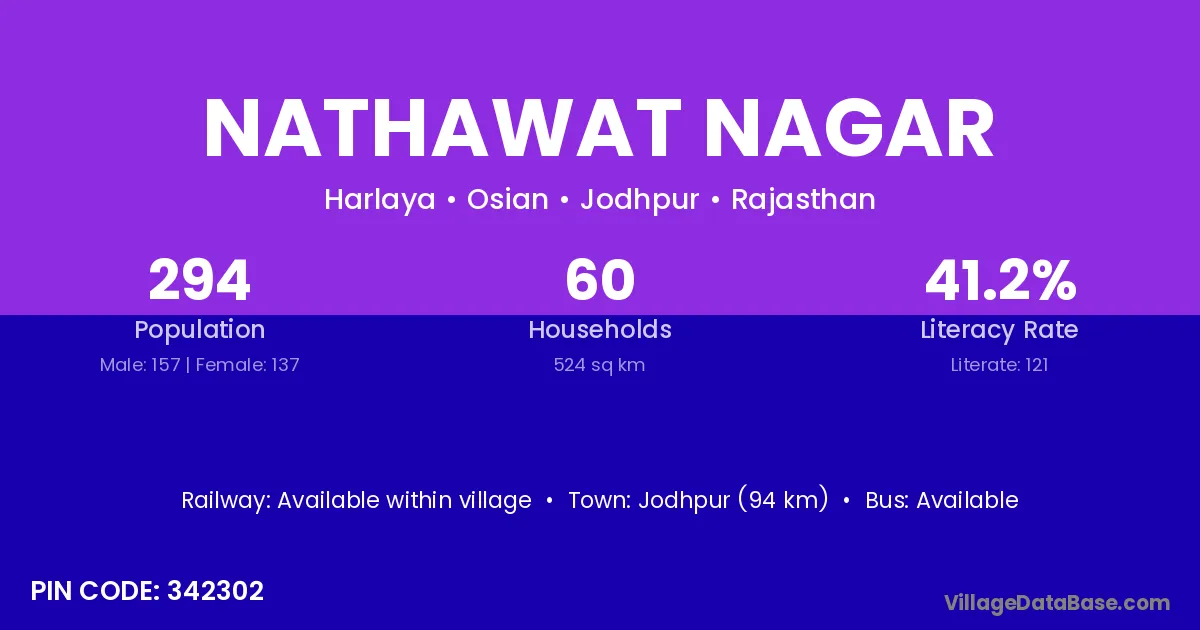 Jodhpur (94 km) is the nearest town to Nathawat Nagar village for major economic activities and is located approximately 94 km away.