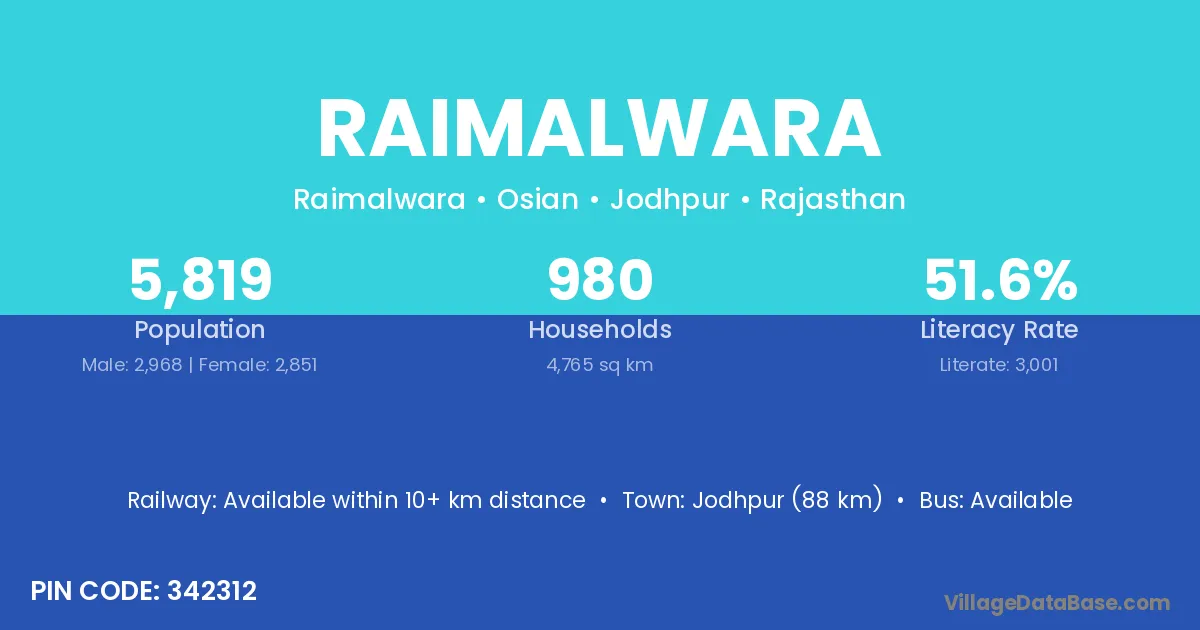 Jodhpur (88 km) is the nearest town to Raimalwara village for major economic activities and is located approximately 88 km away.
