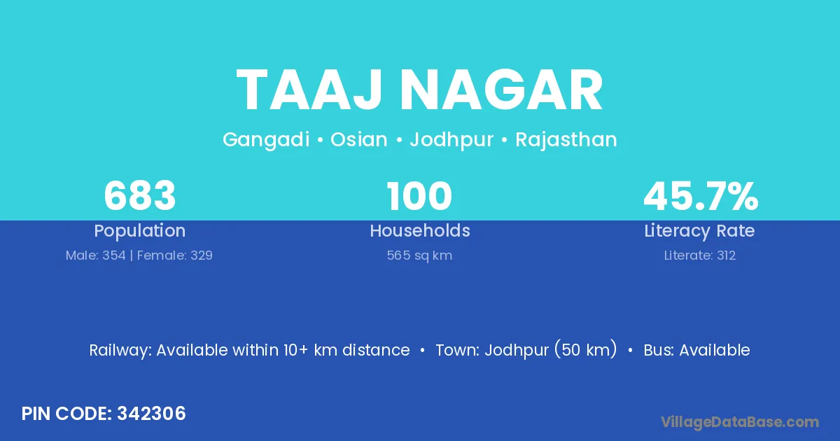 Jodhpur (50 km) is the nearest town to Taaj Nagar village for major economic activities and is located approximately 50 km away.