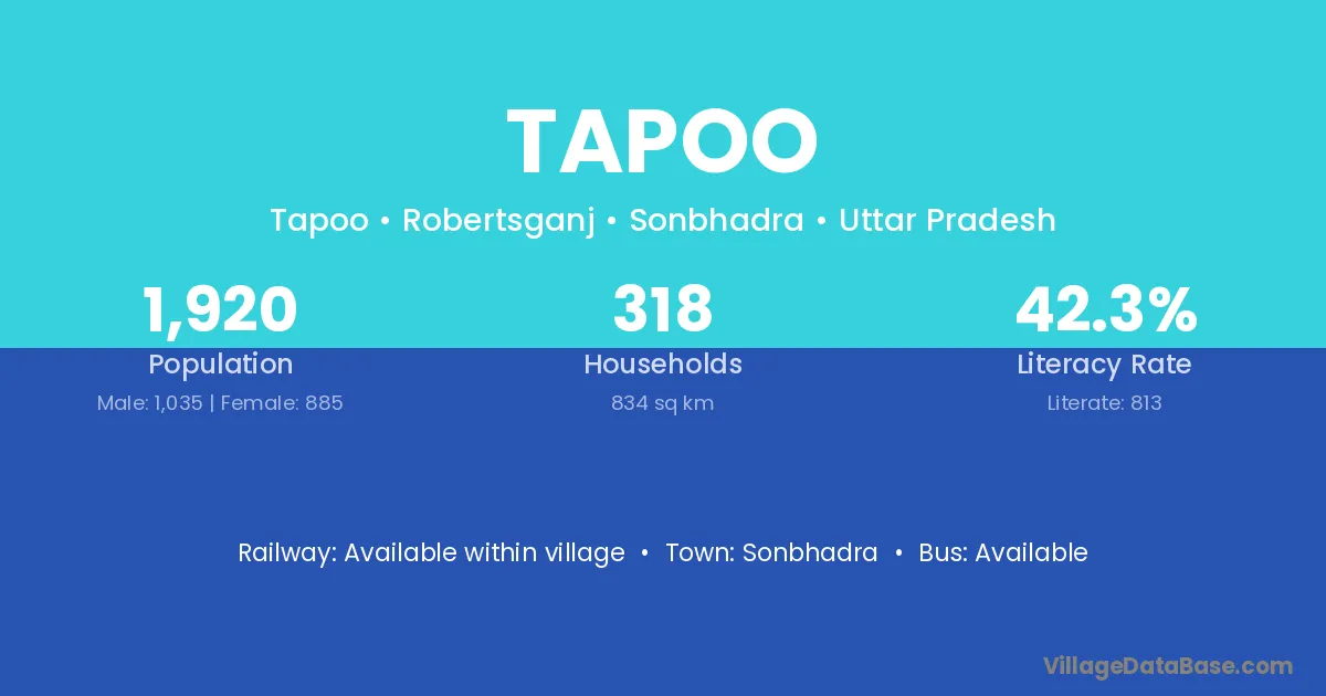 The literacy rate of Tapoo village is 47.02%. Male literacy stands at 60.81% and female literacy at 32.23%.