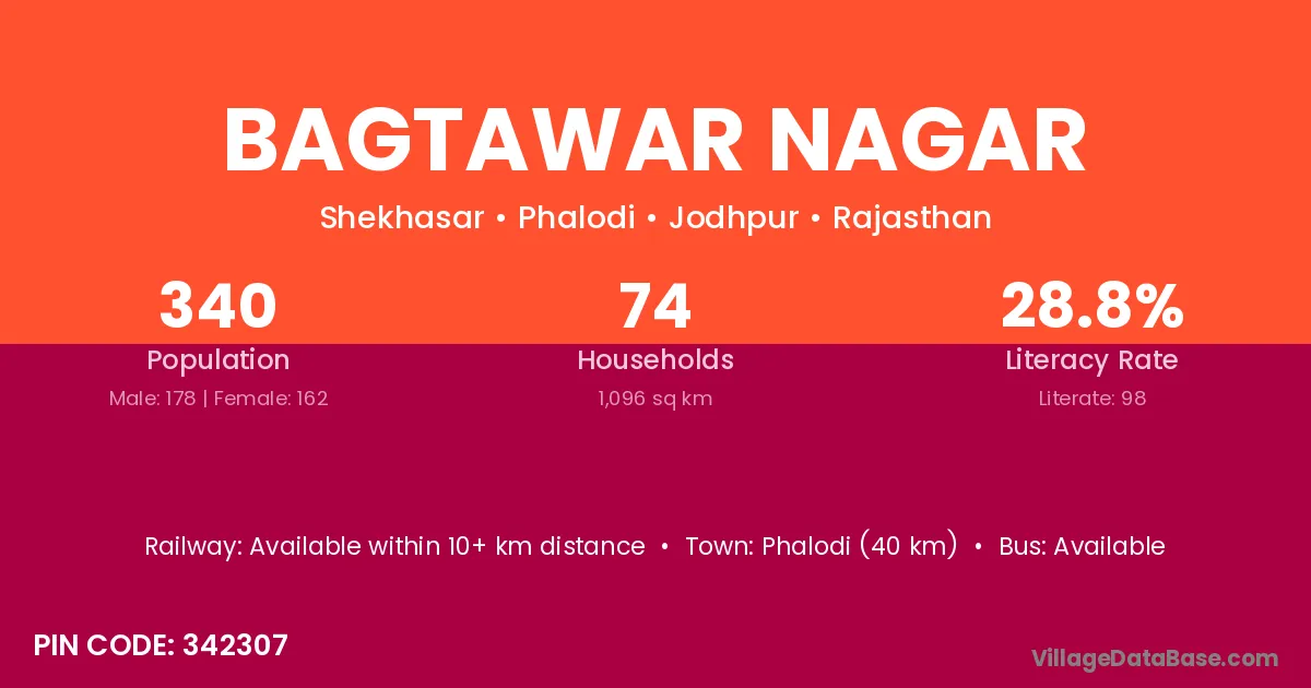 Phalodi (40 km) is the nearest town to Bagtawar Nagar village for major economic activities and is located approximately 40 km away.