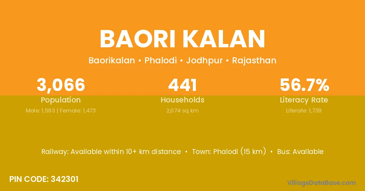 Phalodi (15 km) is the nearest town to Baori Kalan village for major economic activities and is located approximately 15 km away.