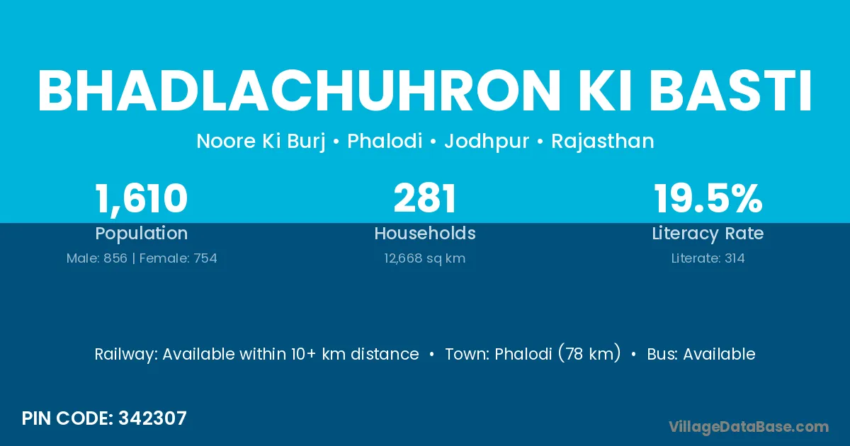 Phalodi (78 km) is the nearest town to Bhadlachuhron Ki Basti village for major economic activities and is located approximately 78 km away.