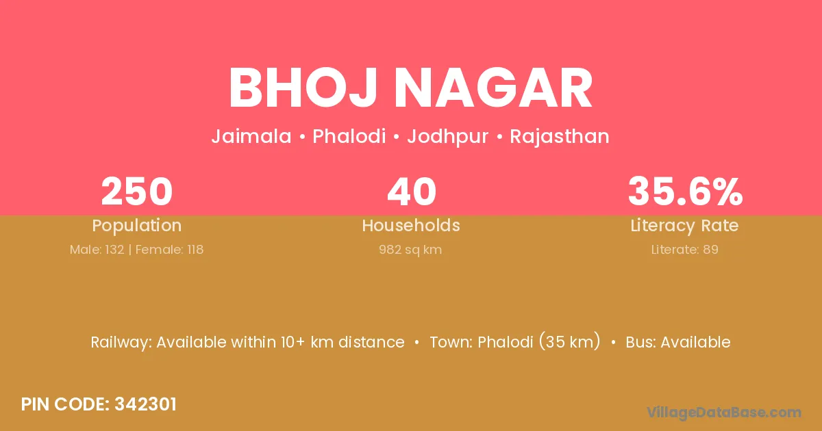 Phalodi (35 km) is the nearest town to Bhoj Nagar village for major economic activities and is located approximately 35 km away.