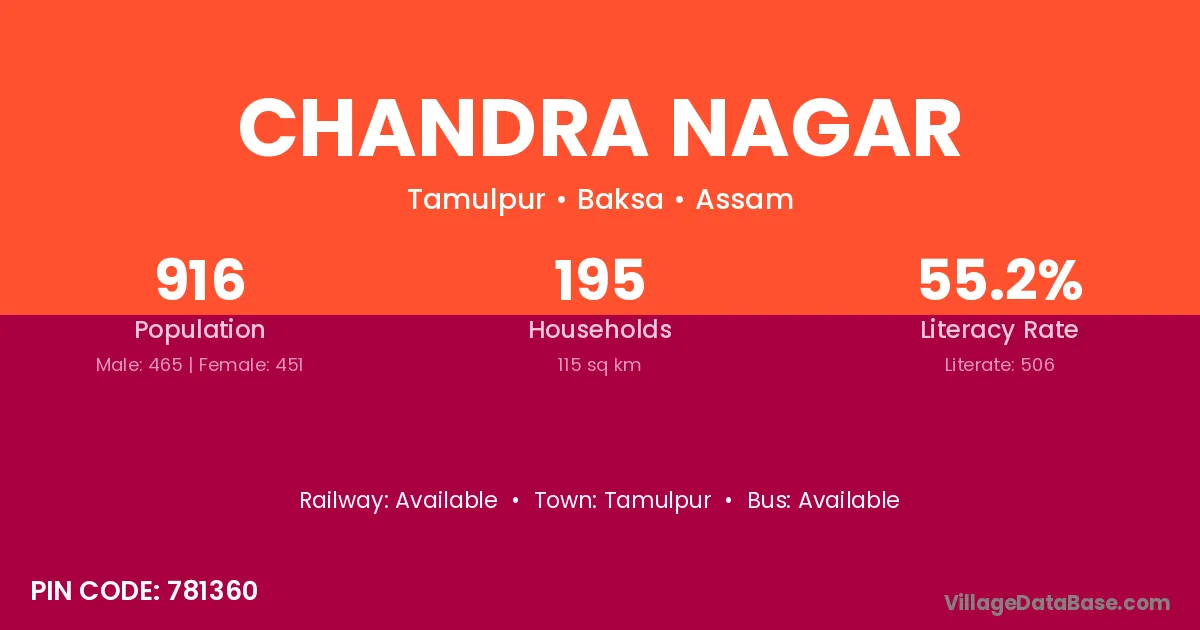The literacy rate of Chandra Nagar village is 34.30%. Male literacy stands at 36.87% and female literacy at 31.49%.