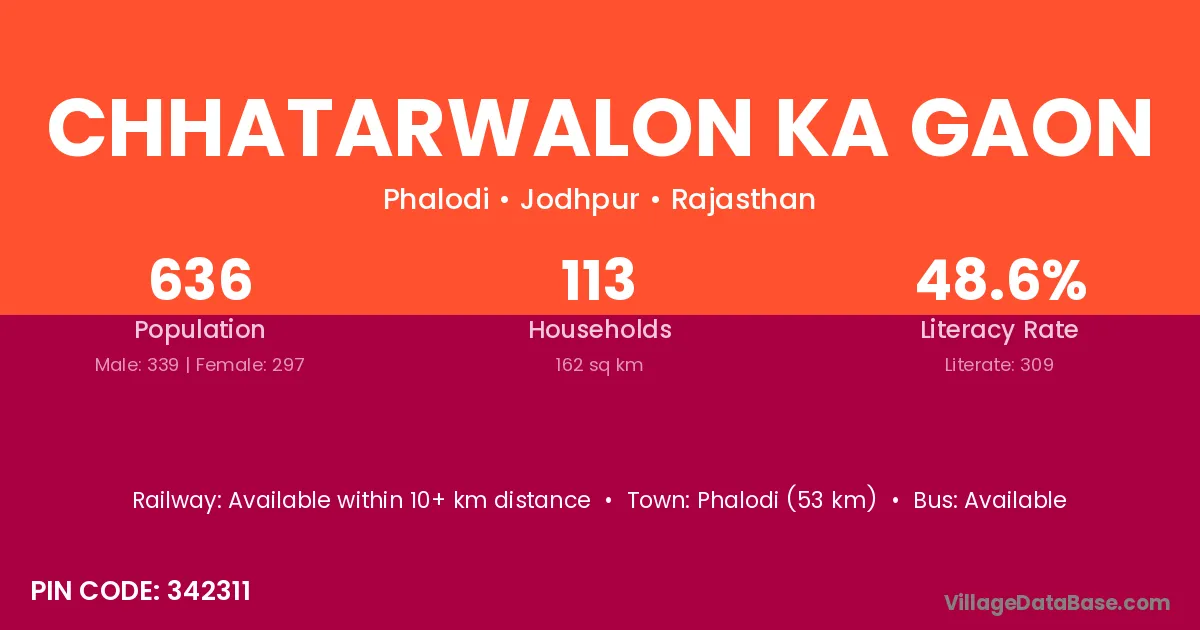 Chhatarwalon Ka Gaon village has a total population of 636 people, of which 339 are males and 297 are females.