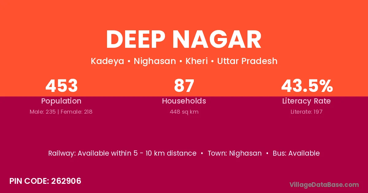 Deep Nagar village has a total population of 356 people, of which 184 are males and 172 are females.