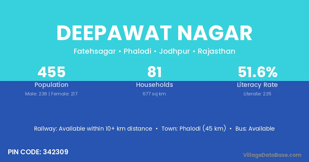 Phalodi (45 km) is the nearest town to Deepawat Nagar village for major economic activities and is located approximately 45 km away.