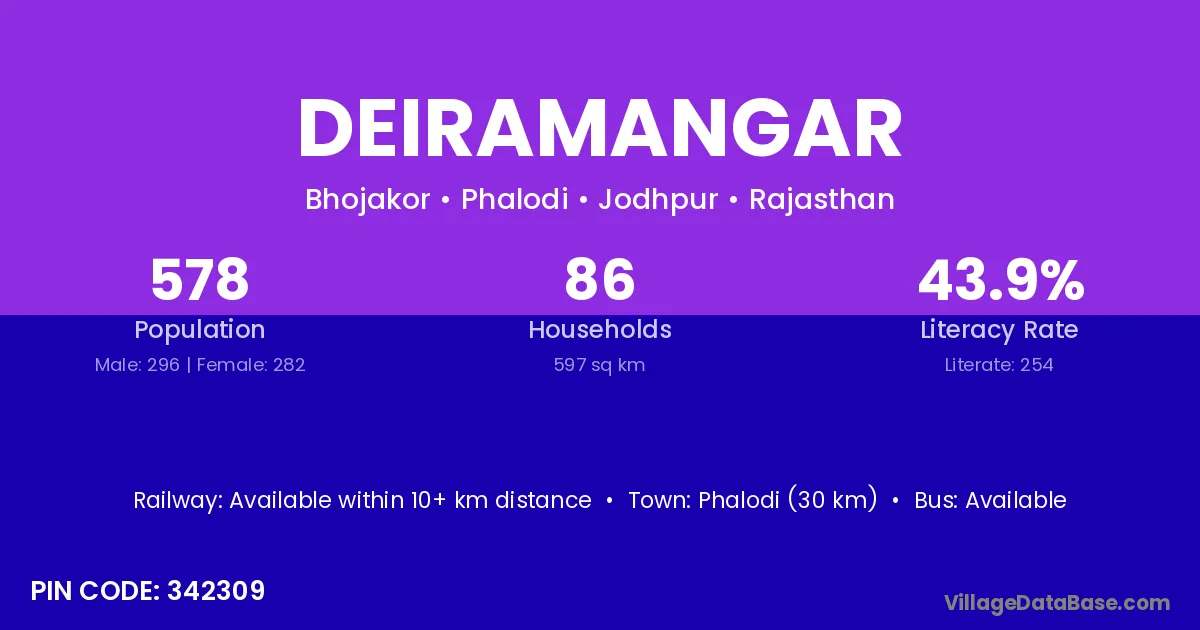 Phalodi (30 km) is the nearest town to Deiramangar village for major economic activities and is located approximately 30 km away.