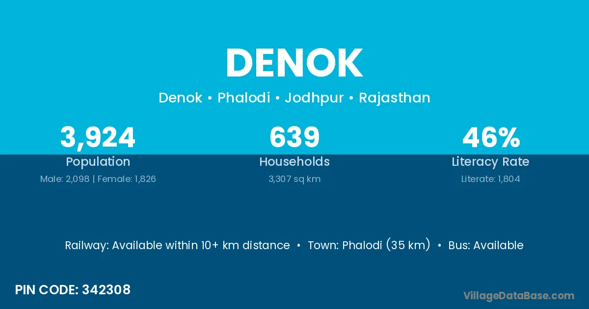 Phalodi (35 km) is the nearest town to Denok village for major economic activities and is located approximately 35 km away.