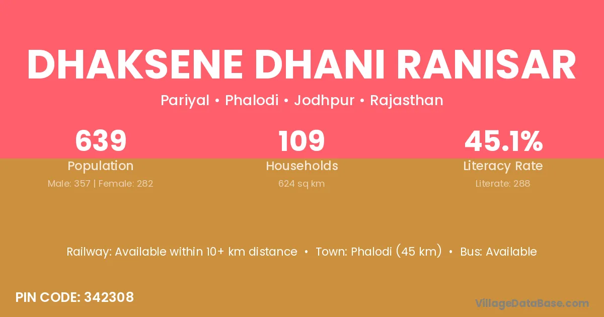 Dhaksene Dhani Ranisar village has a total population of 639 people, of which 357 are males and 282 are females.