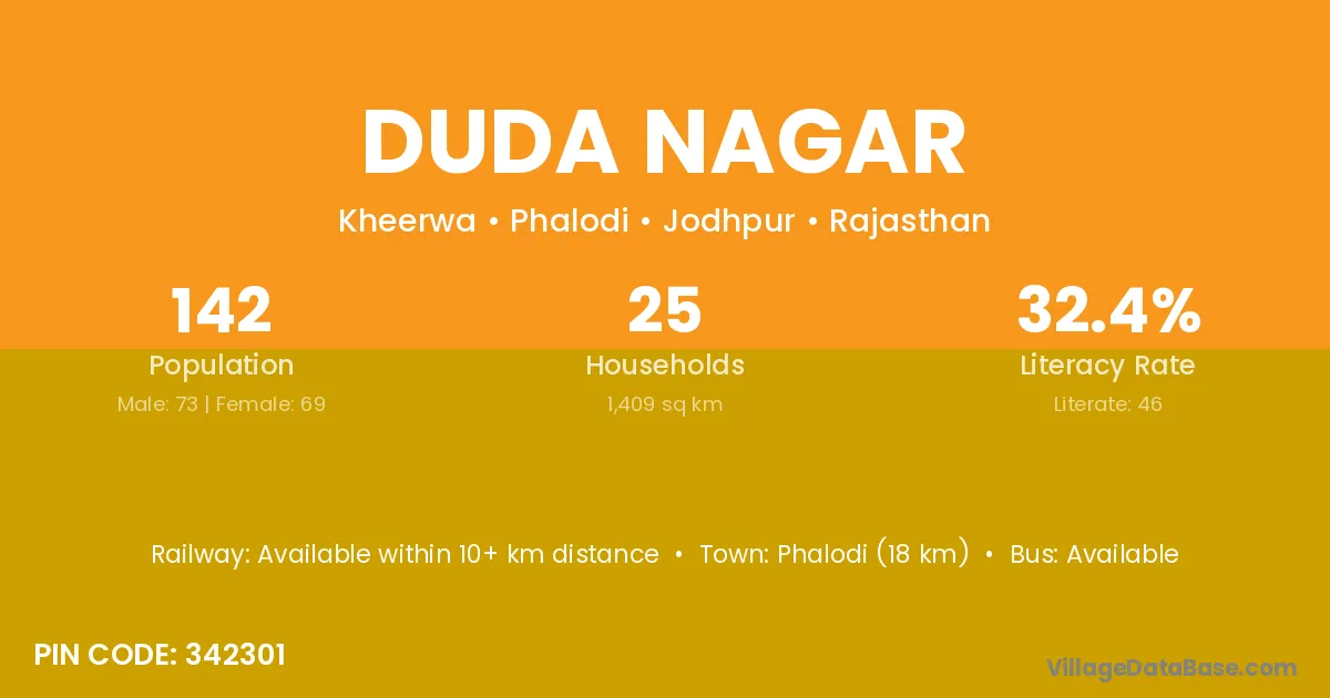 Phalodi (18 km) is the nearest town to Duda Nagar village for major economic activities and is located approximately 18 km away.