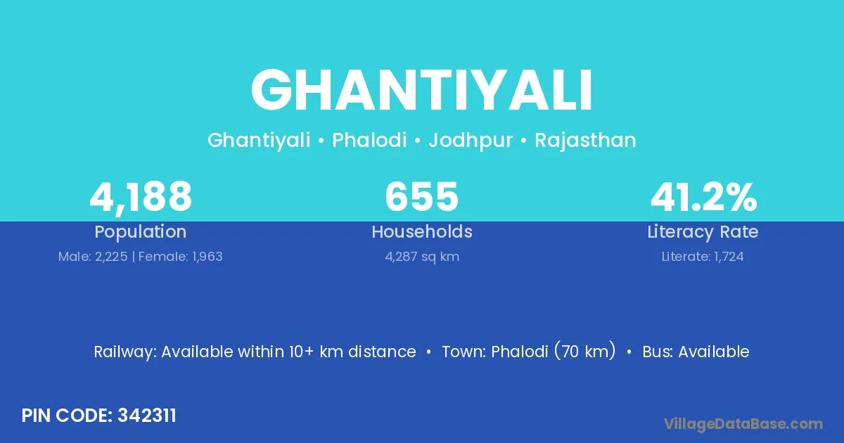 Phalodi (70 km) is the nearest town to Ghantiyali village for major economic activities and is located approximately 70 km away.