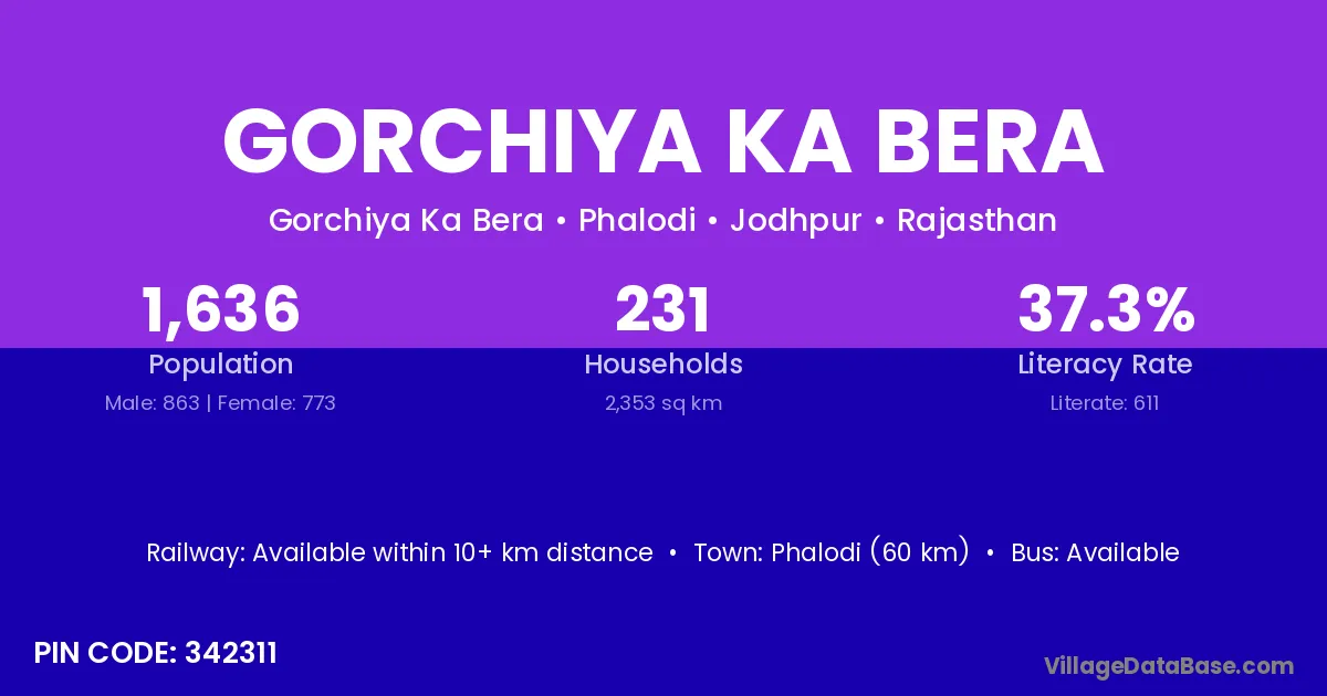 Phalodi (60 km) is the nearest town to Gorchiya Ka Bera village for major economic activities and is located approximately 60 km away.