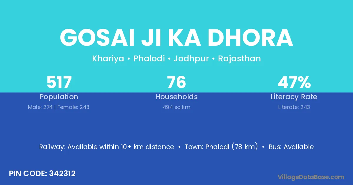 Phalodi (78 km) is the nearest town to Gosai Ji Ka Dhora village for major economic activities and is located approximately 78 km away.
