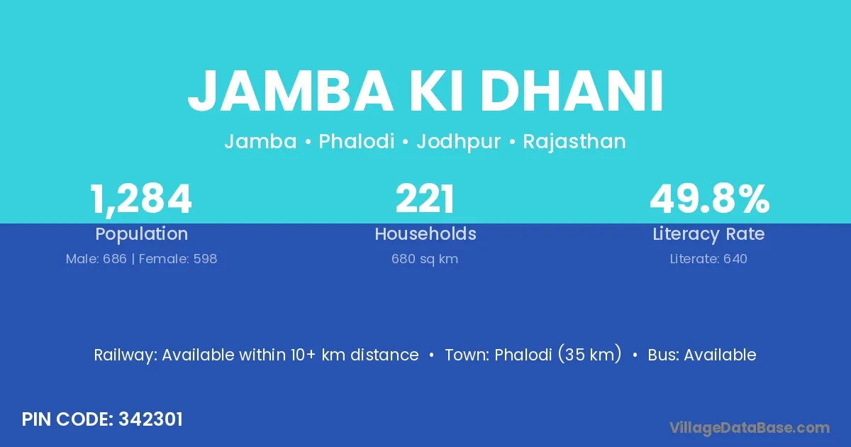 Phalodi (35 km) is the nearest town to Jamba Ki Dhani village for major economic activities and is located approximately 35 km away.