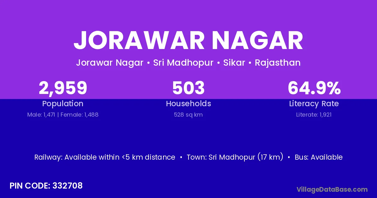Phalodi (67 km) is the nearest town to Jorawar Nagar village for major economic activities and is located approximately 67 km away.