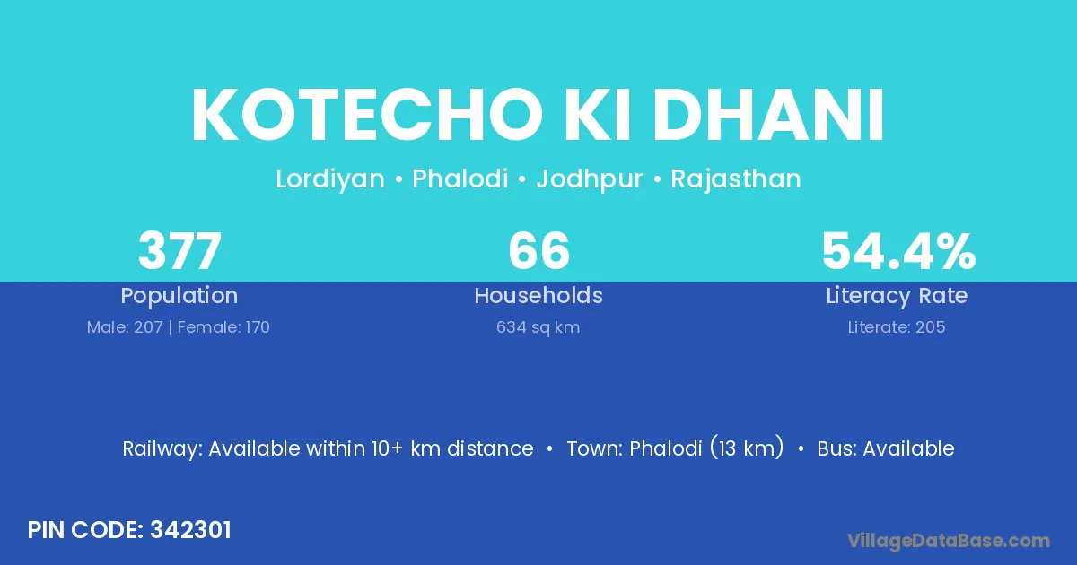 Phalodi (13 km) is the nearest town to Kotecho Ki Dhani village for major economic activities and is located approximately 13 km away.